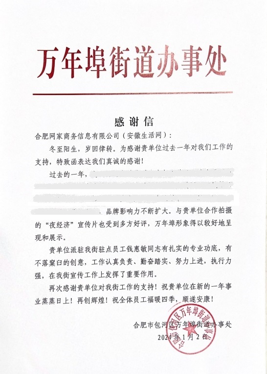 万年埠街道感谢信