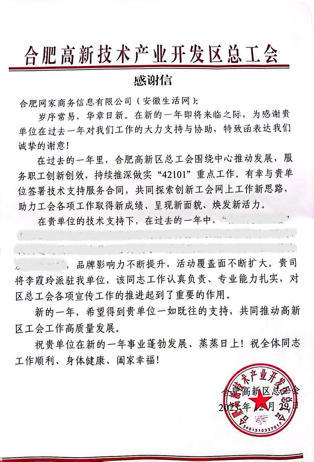 高新区总工会感谢信